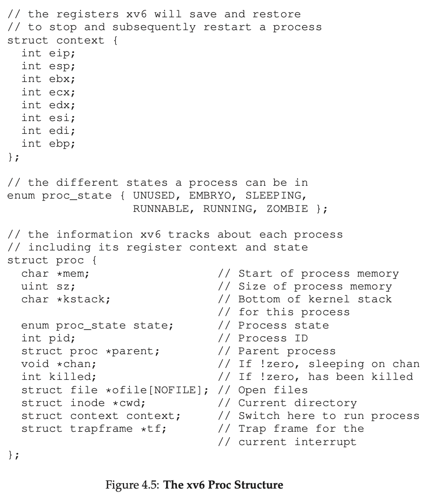 위의 코드는 프로세스 구조를 나타낸 코드입니다. proc 구조체의 속성 중 struct context context; 부분이 context switch에 사용되는 부분입니다. 위의 구조를 사용하면 프로세스가 종료 후에 메모리에서 제거하지 않을 수도 있는데 이러한 상태를 좀비 상태라고 합니다. 이는 보통 부모 프로세스가 자식 프로세스가 끝나기를 기다릴 때 사용할 수 있습니다.