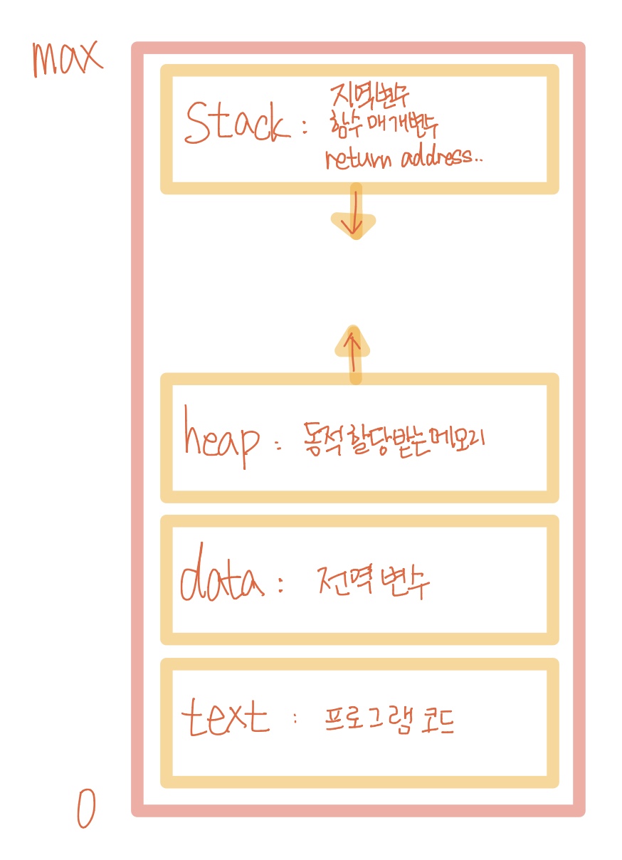 Dynamic allocation 단계에서는 메모리에 적재된 프로그램의 데이터를 아까 위에서 본 그림처럼 배치합니다. Stack공간에는 지역변수, 함수 매개변수 그리고 return address를 저장합니다. Heap 공간에는 동적 할당 하는 데이터가 저장되며 이는 C언어에서 malloc(), free()로 관리할 수 있습니다.