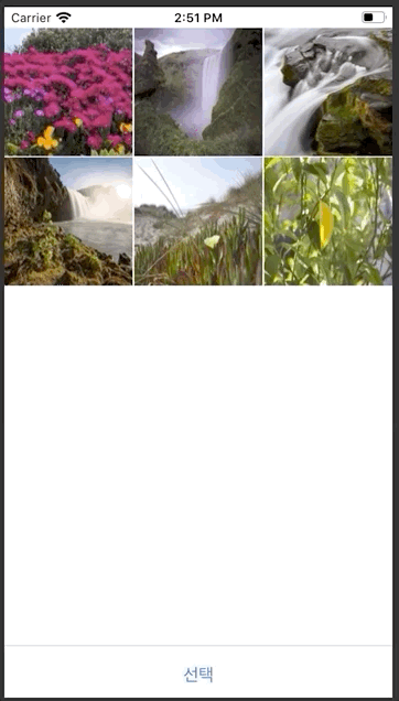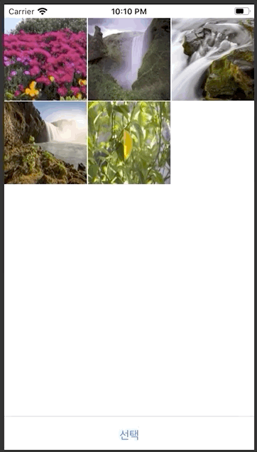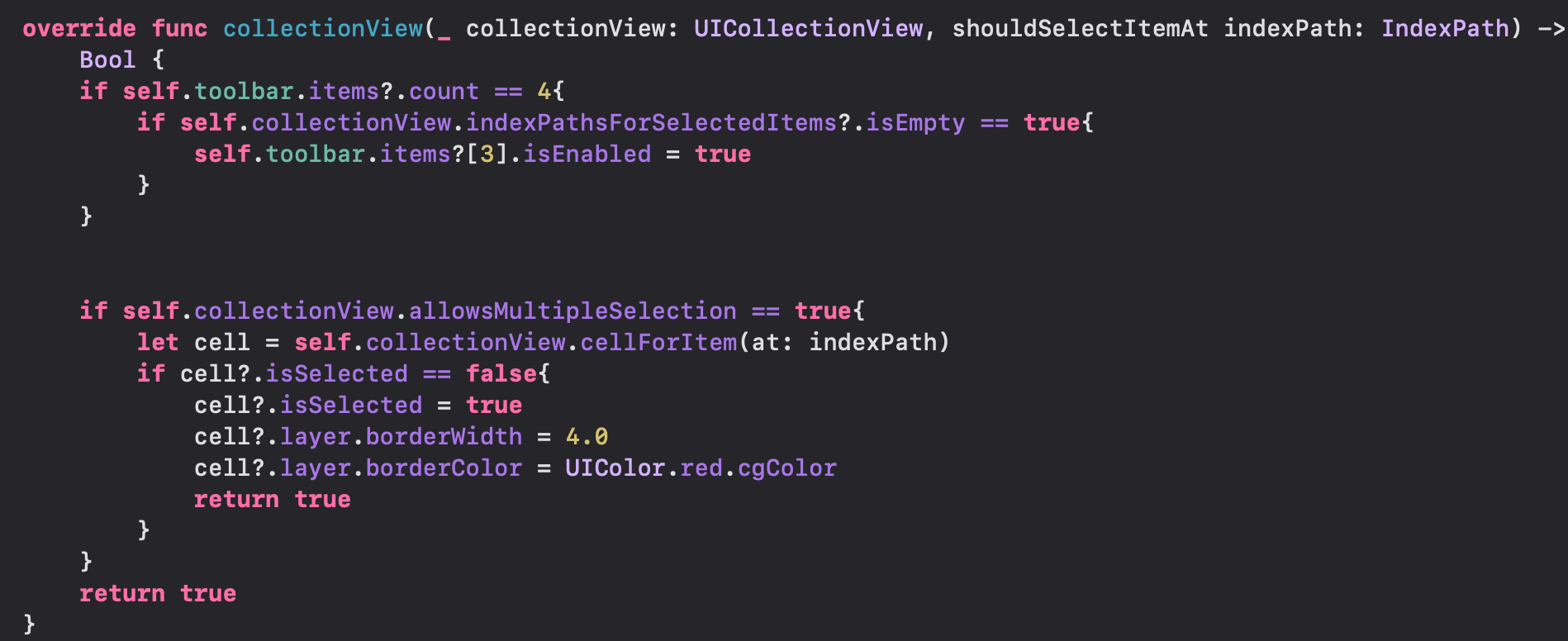 그전에 저번에 정의한 선택, 취소를 나타내는 버튼을 누르면 컬렉션 뷰의 설정을 하나 바꿔주었는데. 이는 allowsMultopleSelection이라는 프로퍼티로 여러 개의 셀을 선택하도록 허용할 것이냐에 대한 값입니다. 이 값이 true면 셀을 여러 개 선택할 수 있고 false라면 셀을 여러 개 선택할 수 없죠. 이를 통해 셀이 선택되었을 때도 구분해 주려고 합니다.