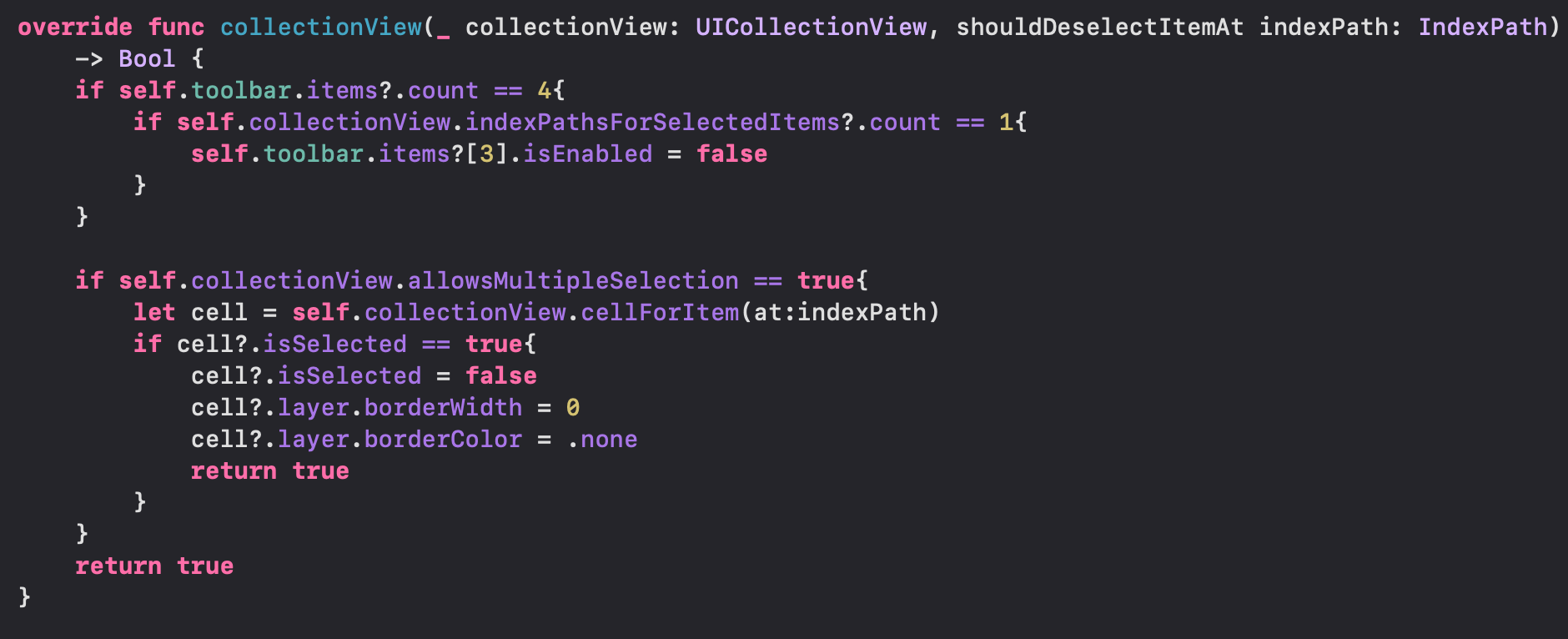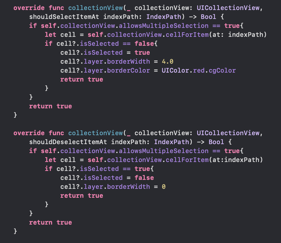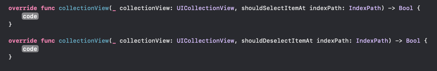 위의 두 메서드가 이번에 사용할 델리게이트 메서드인데요, 매개변수를 자세히 살펴보면 하나는 shouldSelectItemAt, 하나는 shouldDeselectItemAt인 것을 확인할 수 있습니다. 즉 하나는 선택이 되었을 때 감지하고 하나는 선택이 해제되었을 때 감지하는 메서드인 것을 알 수 있어요!
