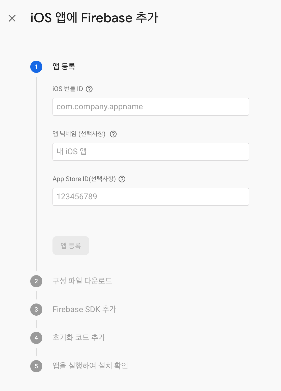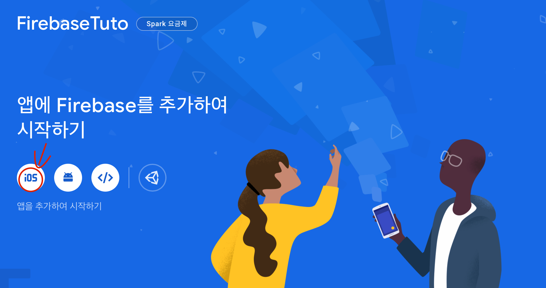 다시 파이어 베이스 콘솔로 돌아가 위에 표시된 iOS를 눌러 앱을 추가해보겠습니다.