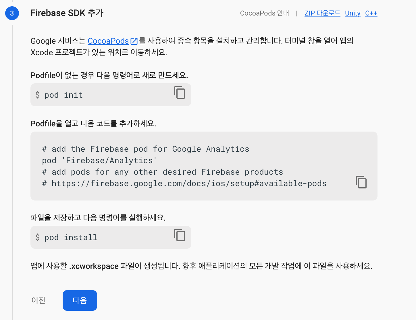 다음을 누르면 위와 같은 화면이 나옵니다. 이제 터미널을 켜시고 Xcode 프로젝트를 만든 위치로 가야 합니다.