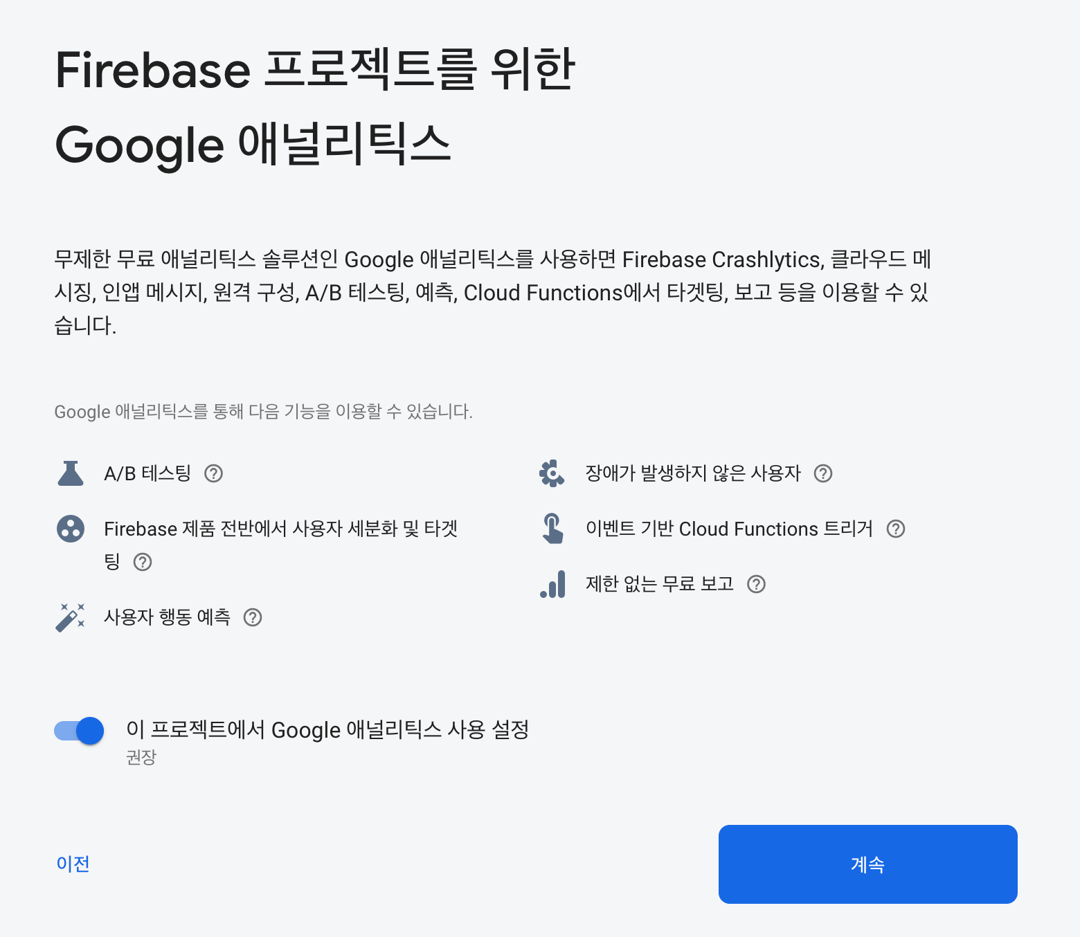 만약 정상적으로 실행했는데도 활성화되지 않으면 이 단계 건너뛰기를 누르신 뒤 파이어베이스 콘솔에서 Dashboard로 이동하여 잘 연결됐는지 확인할 수도 있습니다.