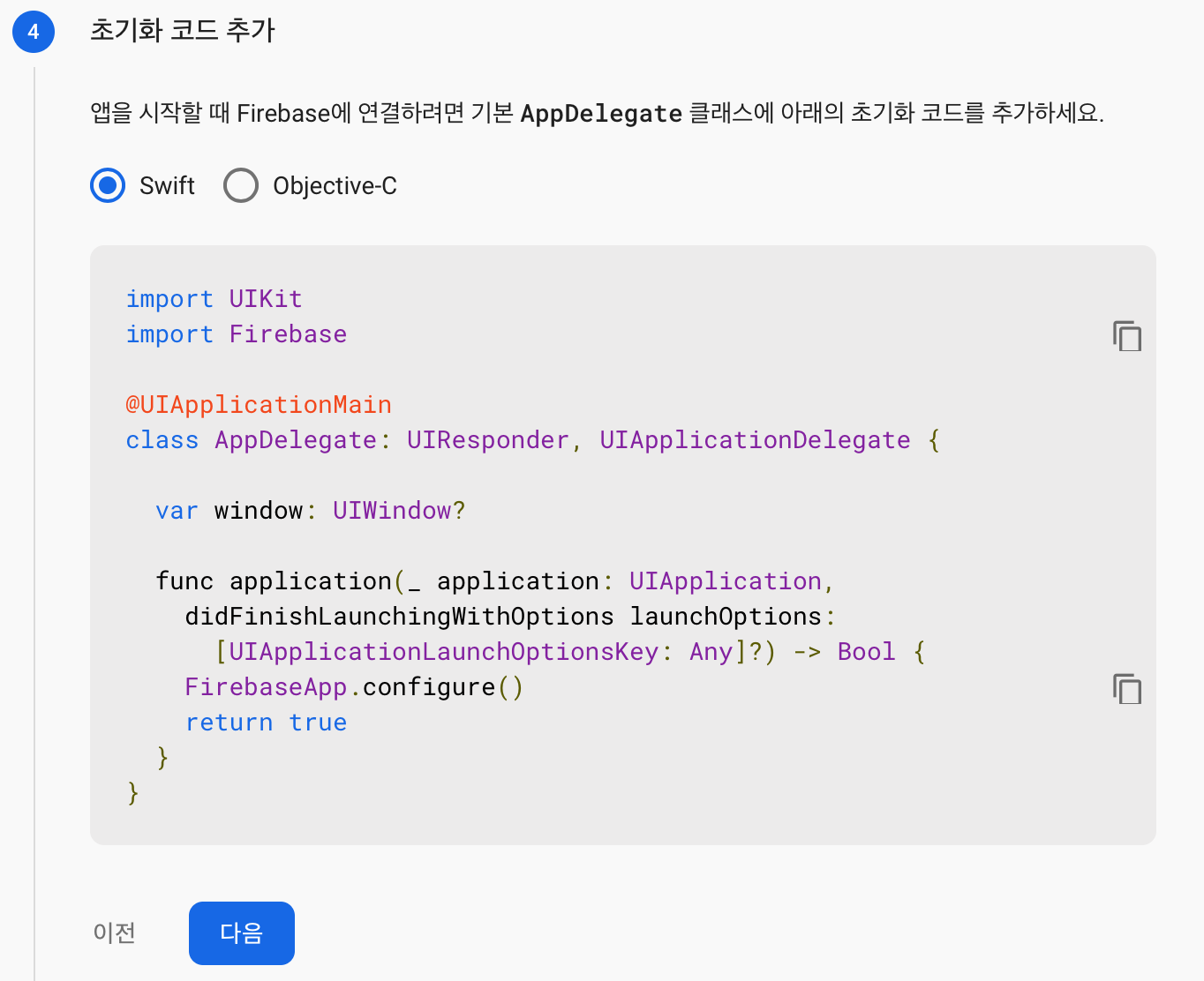 다시 파이어 베이스 콘솔로 돌아가 다음을 누르면 위와 같은 화면이 나오게 됩니다. 위에 나온 코드를 AppDelegate.swift 파일에 추가해주시면 되는데 최근에 iOS에서 바뀐 게 있습니다. 예전에는 AppDelegate만 존재했는데 이젠 SceneDelegate도 존재하죠..