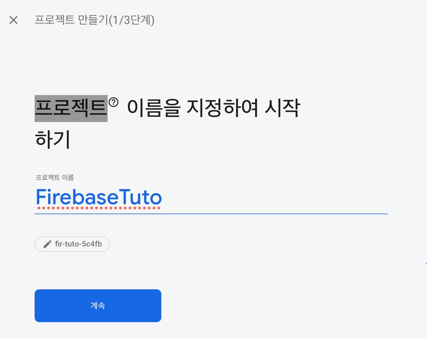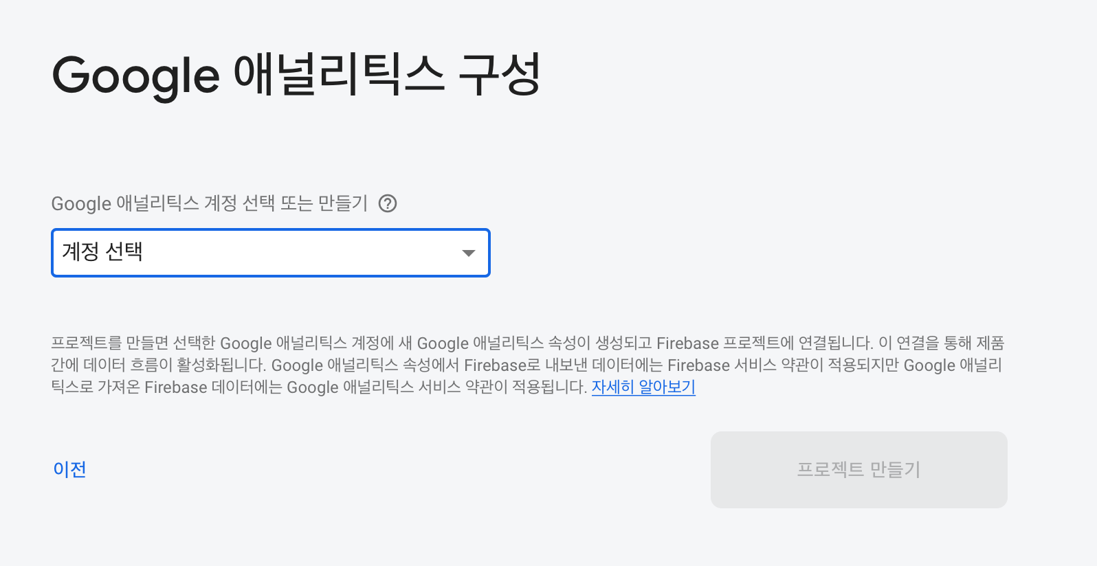계정 선택하시면 default Account for Firebase가 있으실 거예요. 그거 선택하시고 프로젝트 만들기 눌러주시면 Firebase에서 프로젝트를 만드는 것은 끝나게 됩니다.