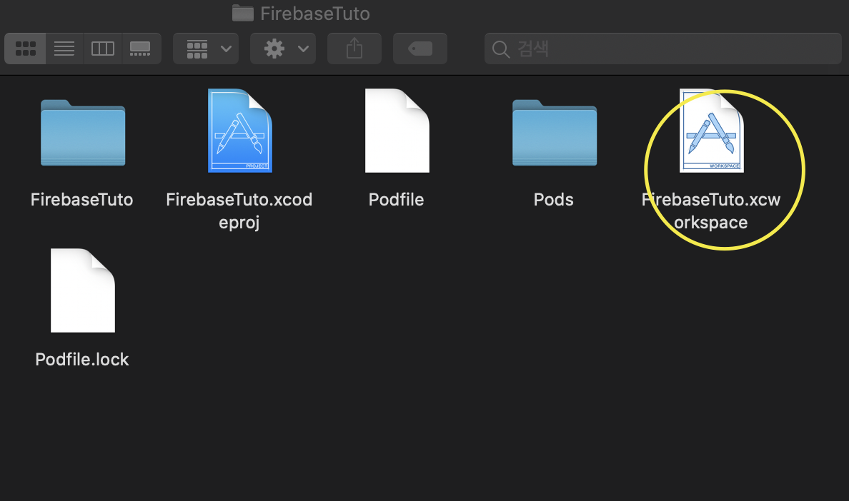 그리고 아주 중요한 건데!!! 방금 명령어를 실행하면 위와같이 .xcworkspace 확장자를 가진 파일이 프로젝트 폴더에 추가되는데 이젠 이 파일로 모든 작업을 진행해야 합니다!!!
