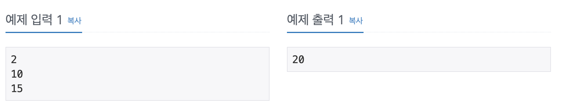 주어진 로프는 10, 15만큼의 중량을 버틸 수 있는 로프이고 각각을 개별로 사용하면 15의 중량을 버틸 수 있지만 병렬로 연결하면 각각의 로프에 모두 고르게 10의 중량을 버틸 수 있으므로 20의 중량을 버틸 수 있게 되어 출력은 20이 나온다.