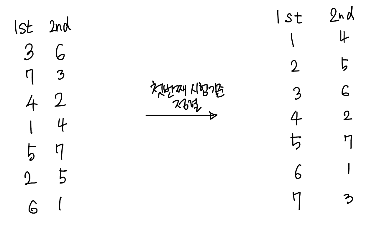 이렇게 문제를 이해하고 보니 우선 첫 번째 시험의 등수를 기준으로 정렬하면 어떨까라는 생각이 들었다.