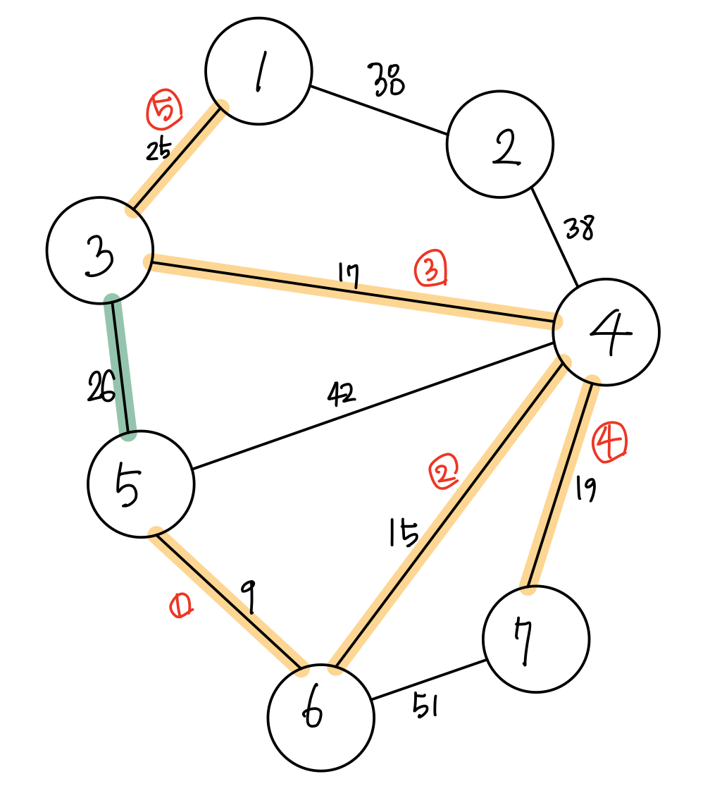 위의 그림에서 26 가중치를 가진 간선은 초록색으로 표시했습니다.