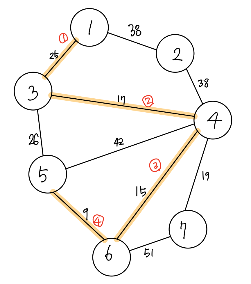 먼저 정점 1에는 25, 38 가중치를 가진 간선들이 있고 여기서 작은 간선을 선택합니다.