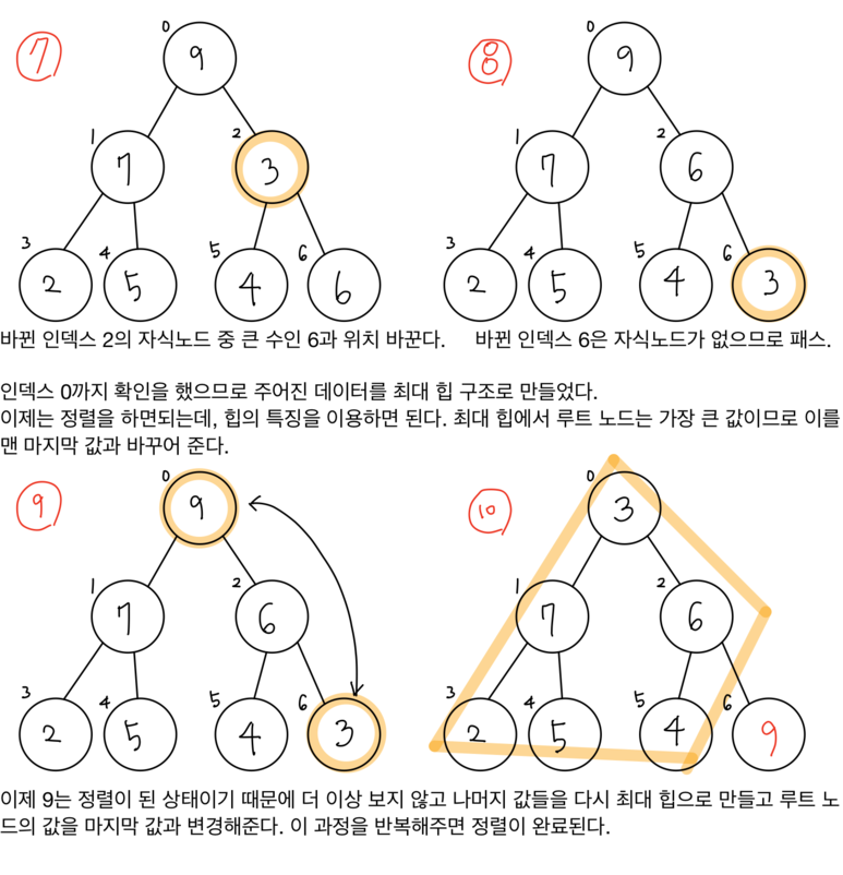 위의 그림의 1~8까지의 과정이 힙 구조로 만드는 과정이고 9~10 과정은 힙 구조로 만들어진 자료구조를 정렬하는 방법입니다.