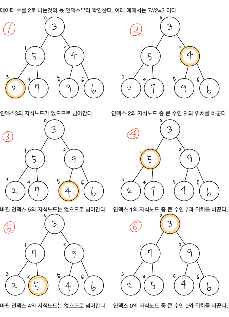 그런 뒤 인덱스 0~인덱스 5까지 다시 힙 구조로 변경해줍니다.