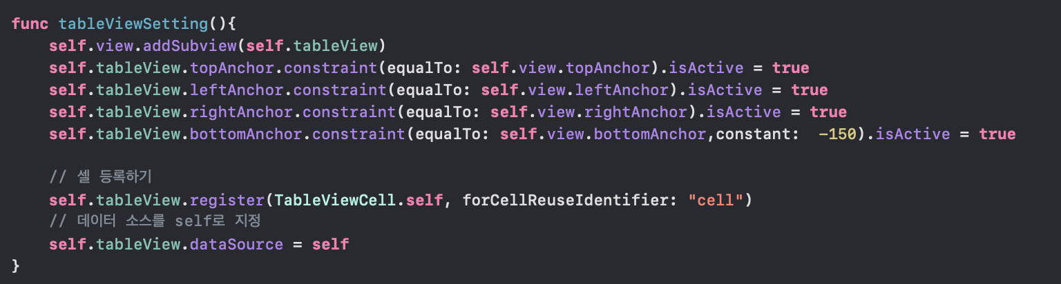 위의 코드와 같이 테이블 뷰를 현재 뷰에 추가해주시면 됩니다.