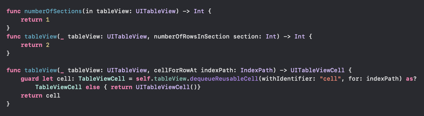 UITableViewDataSource 델리게이트를 사용하기 위해서는 반드시 위의 두 함수가 필요합니다.