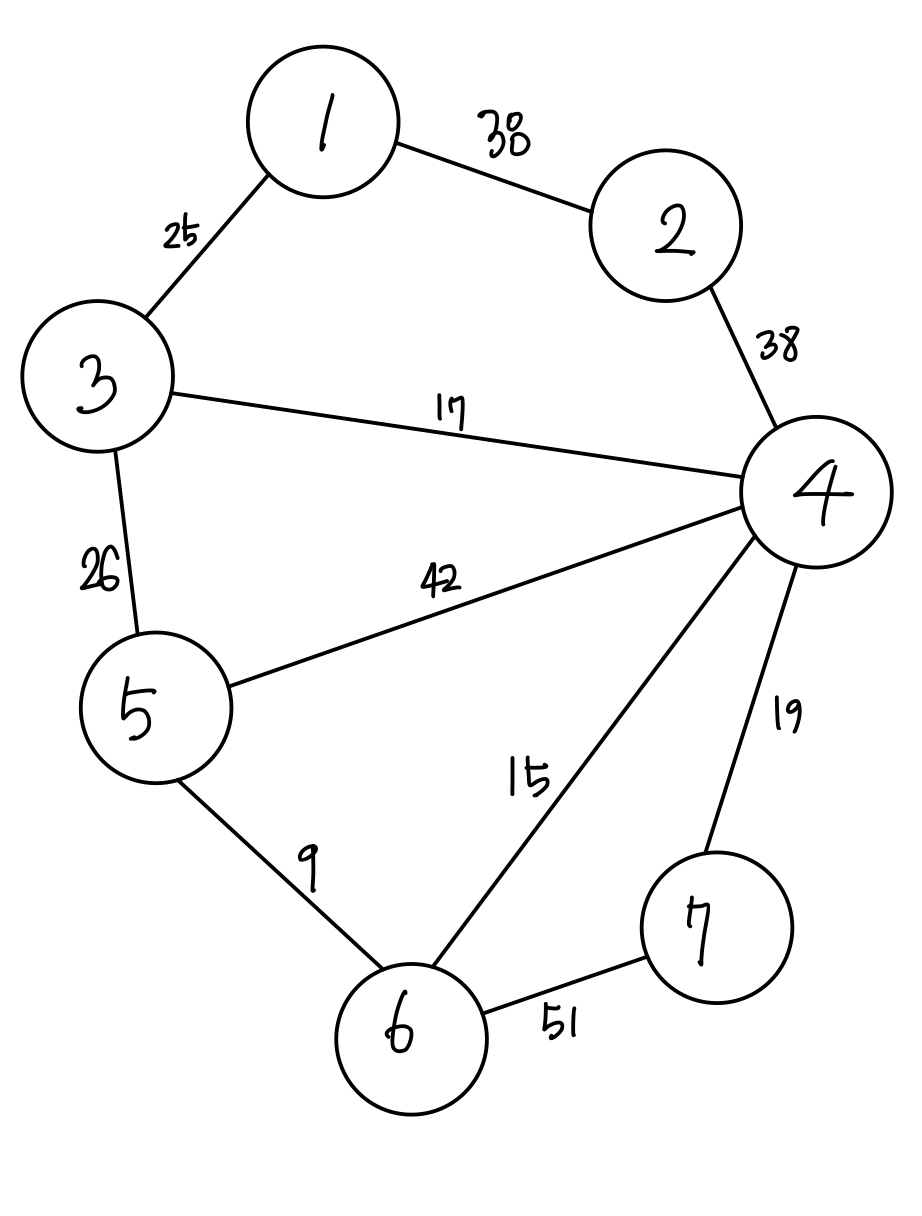 var graph: [[Int]] = [[1,2,38],[1,3,25],[2,4,38],[3,4,17],[3,5,26],[5,4,42],[5,6,9],[6,4,15],[4,7,19],[6,7,51]]